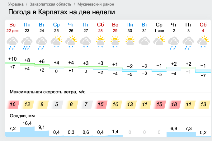 В Карпатах будет относительно тепло. Утром, 1 января, из-за туч выйдет солнце. От -1 до -3°С днем, и около -5°С ночью будет в Карпатах на Новый Год.