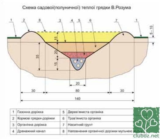 Общее устройство теплой грядки Розума имеет следующую структуру: