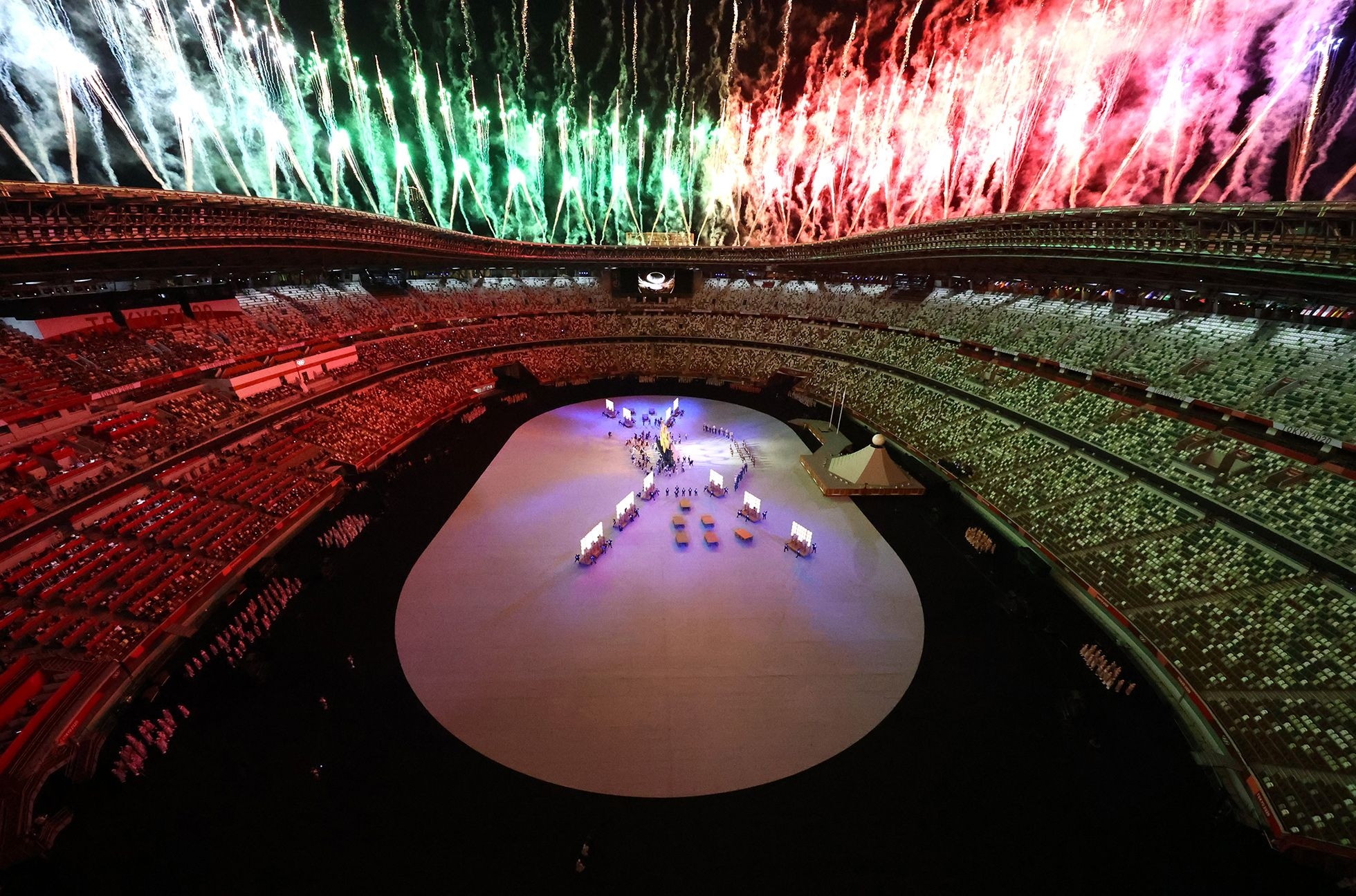 На стадион вынесли пять олимпийских колец, которые были сделаны из деревьев, посаженных в 1964 году участниками предыдущей проходившей в Японии летней Олимпиады.