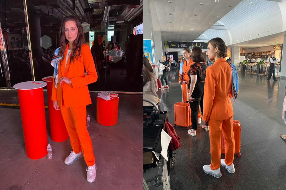 Новая форма базируется на идее динамики и движения, поэтому вместо костюмов с юбками у женщин появятся брючные костюмы с более спортивным кроем, которые мы создали вместе с партнерами из GUDU. Дополняет образ легкий кожаный тренч.