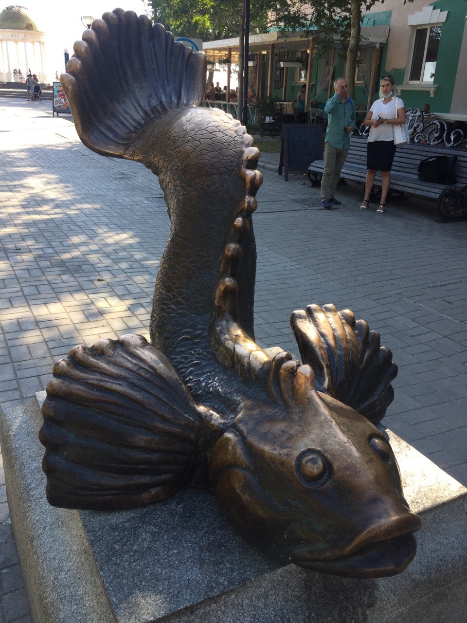 На Приморской площади есть весьма оригинальные памятники Среди них — "Бычок-кормилец". Бердянск действительно славится своими уловами бычка и считается родиной этой рыбы, но в этом году его мало. Поэтому попробовала я бычки всего раз — в кафе. Но об этом позже.