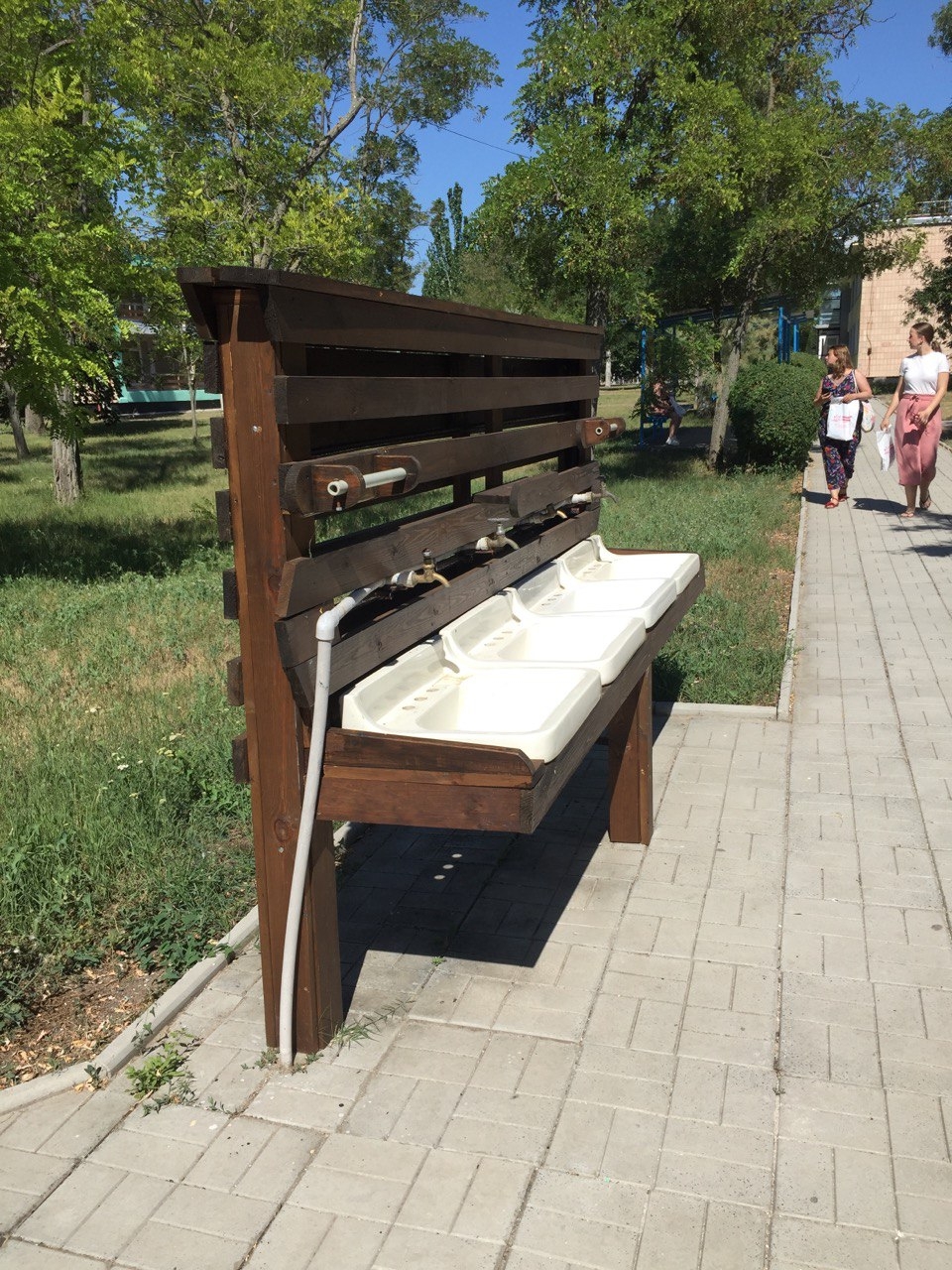 А еще рядом с "Красной гвоздикой" есть пляж, парковая зона и креатив во всем. Посмотрите, одни умывальники чего стоят.