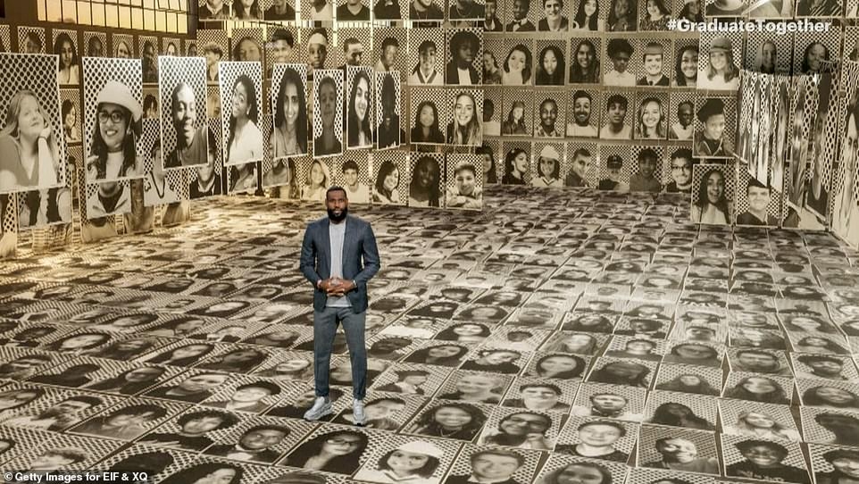 Леброн Джеймс  поздравлял выпускников на импровизированной выставке из их собственных фото. Записывали звезду баскетбола в "зеленой комнате".