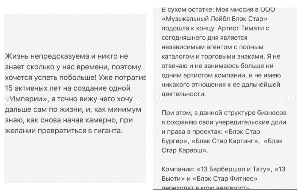 На своей странице в Instagram Тимати заявил, что покидает Black Star. Артист посвятил 15 лет жизни одному из самых популярных лейбов, создав "империю" с нуля.