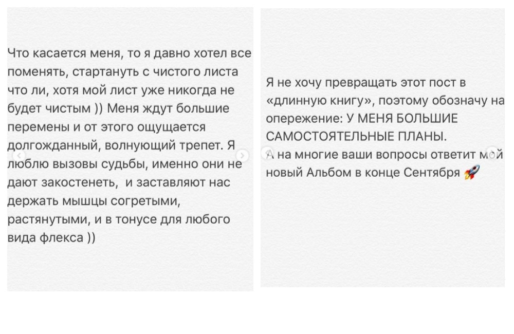 Тимати заявил, что одной из главных причин ухода является желание все поменять и "стартануть с чистого листа". Рэпер признался, что его манит неизвестность и "вызовы судьбы".