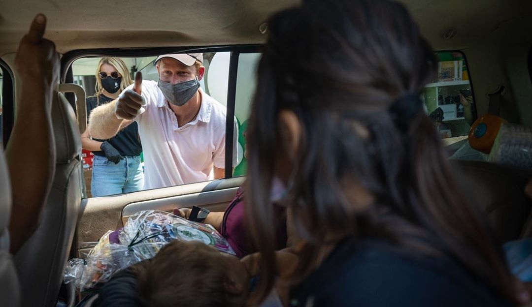 Меган и Гарри были в масках и перчатках. Они выдавали необходимые вещи людям, которые подъезжали к ним на машинах.