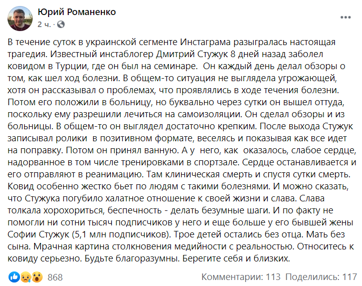 Последняя информация гласит, что Дмитрий Стужук умер из-за осложнений, которые коронавирус дал на сердце, однако в Сети появились новые подробности ужасной гибели блогера.