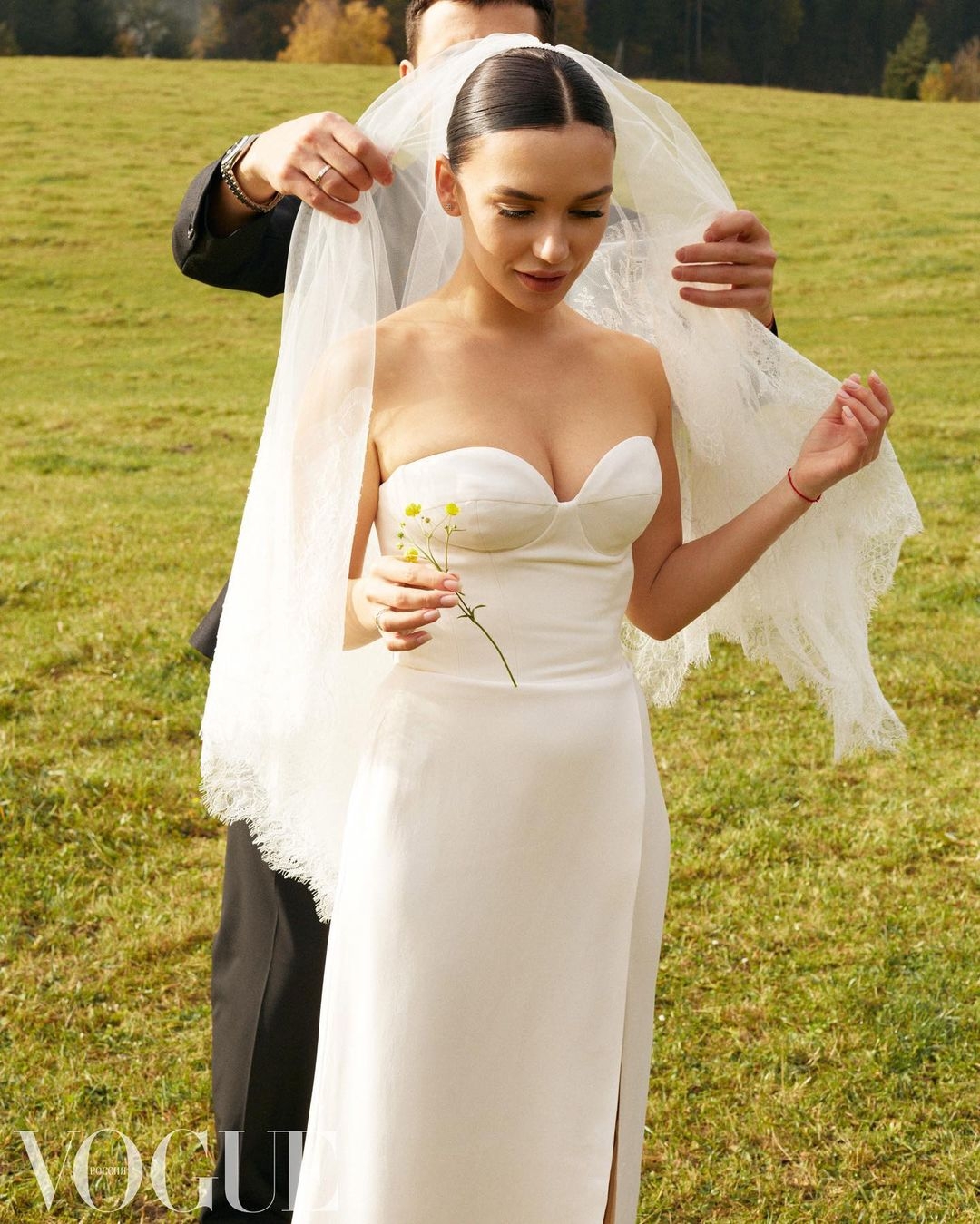 Платье Ulyana Sergeenko — единственное длинное, оно же стало официальным платьем для самой церемонии. С брендом Ульяны меня давно связывают теплые отношения, я его большая поклонница. В этих платьях всегда чувствуешь себя особенной. Признаюсь, я долго не могла определиться с силуэтом, но в итоге решила остановиться на платье с корсетом, а корсеты — визитная карточка бренда. Платье получилось таким, как я и хотела: классическое, лаконичное, в нем нет ничего лишнего, но в нем я чувствовала себя настоящей принцессой. Образ дополнила фата с вышивкой ручной работы из невероятно тонкого кружева,