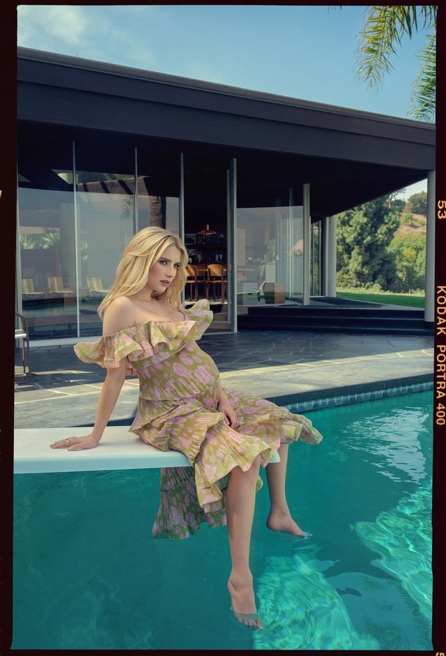Автором фотосессии стала Саша Самсонова — украинский фотограф и близкая подруга Кайли Дженнер. На новых снимках, сделанных возле бассейна, Эмма позирует в эффектном черном бикини, прозрачной накидке и каблуках. Актриса демонстрирует милый животик в белом костюме, состоящем из топа и мини-шортов, а также красуется в легком цветочном платье.