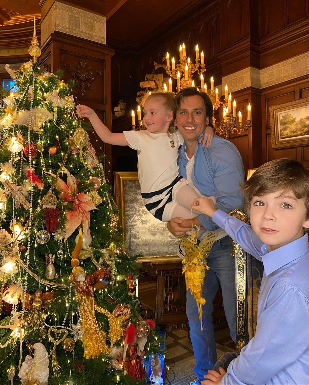 На кадре артист держит на руках красавицу-дочь, которая помогает папе вешать игрушку на елку, а рядом стоит сын с украшением в руках и смотрит в камеру.