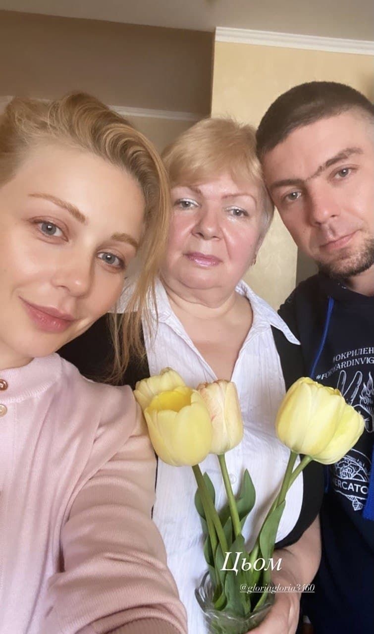 На фото артистка без косметики позировала в теплом пудровом свитере. Рядом с ней изображена мама Светлана Андреевна, одетая в белую рубашку и черную кофту. В руках женщина держит пять желтых тюльпанов, а справа от нее позирует старший сын Станислав.