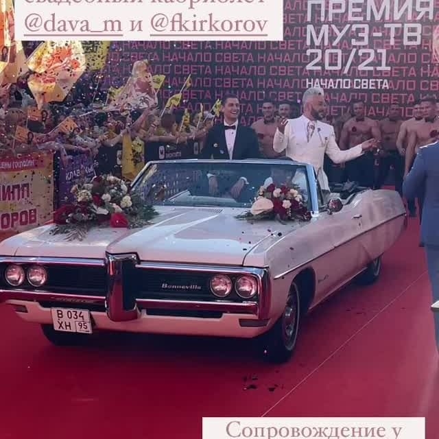 Так, Филипп Киркоров и Давид Манукян появились на белом кабриолете в окружении полуголых накаченных мужчин с розами в руках.