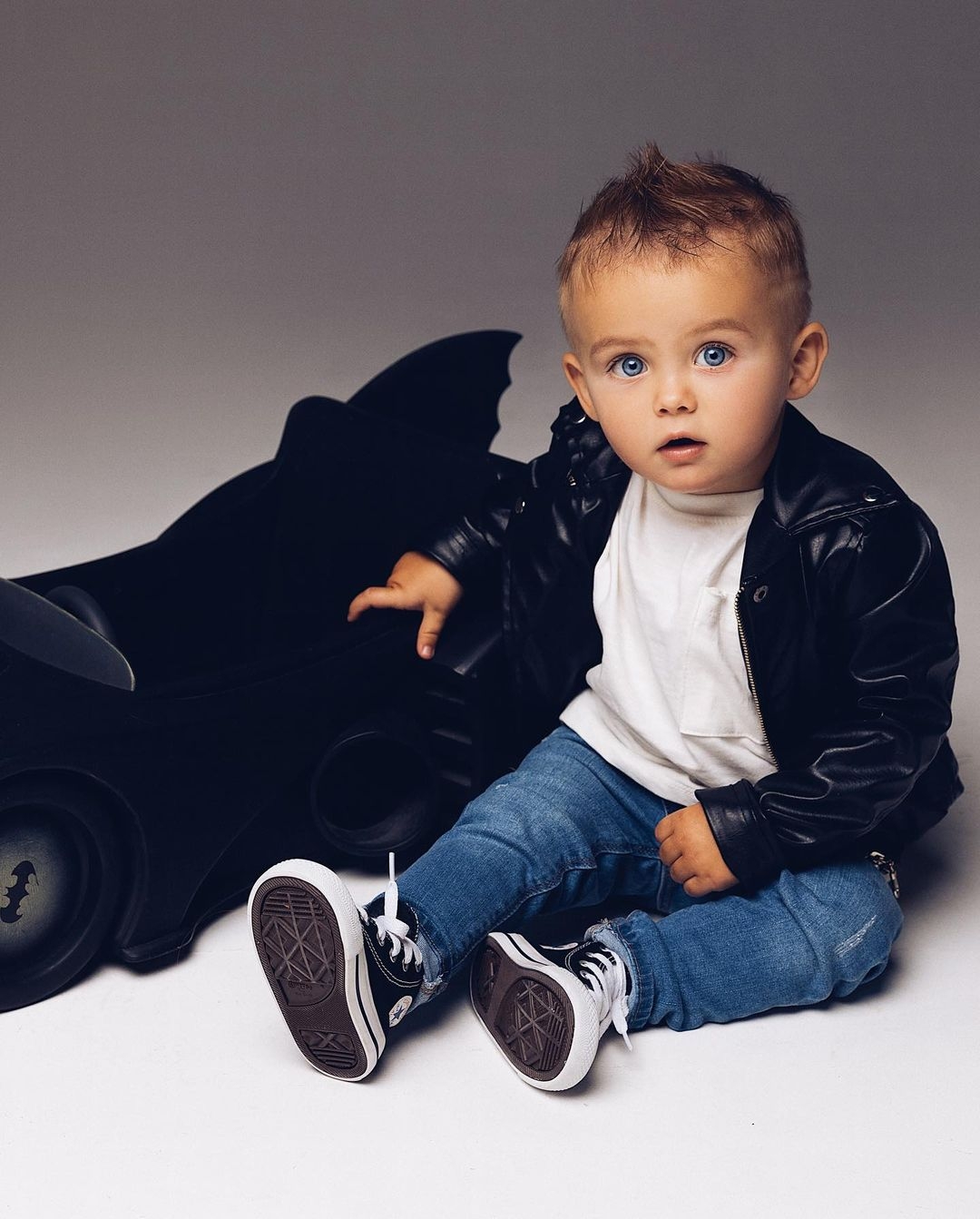 В своем микроблоге звезда Instagram опубликовала умилительные кадры мальчика. На одних снимках его нарядили в красную куртку, черные джинсы и такого же цвета шапку. Образ малыша дополнили очки и цепь на шее. Давид сидит на скейте и улыбается в камеру. На других — сын звездных родителей предстал в белой футболке, кожаной куртке и кедах.