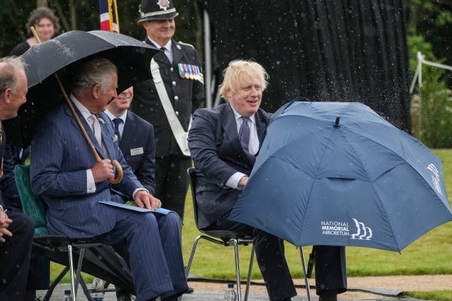 Неловкий момент вызвал улыбки у очевидцев. Не сдержался и принц Чарльз, который искренне рассмеялся из-за неудачных попыток Бориса Джонсона расправить зонтик.