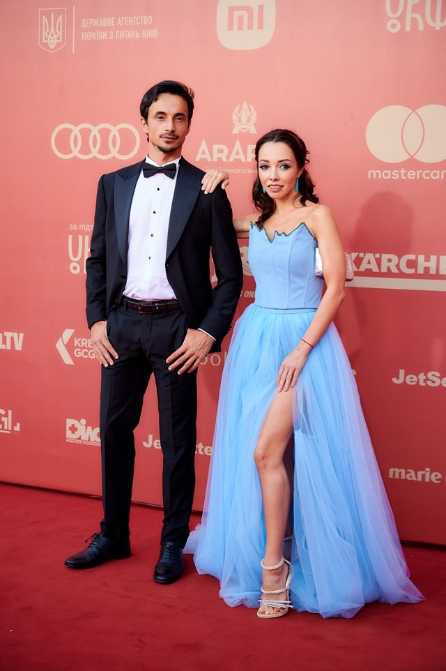 Екатерина Кухар надела воздушное платье небесного оттенка. Событие посетила с мужем Александром Стояновым.