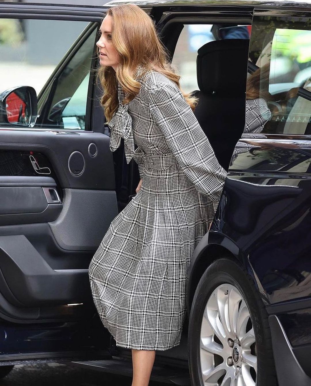 На публике жена принца Уильяма появилась в черно-белом платье в клетку Zara и серых туфлях на высоком каблуке Hugo Boss. Образ получился очень уместным для данного мероприятия и в то же время подчеркнул вкус герцогини.