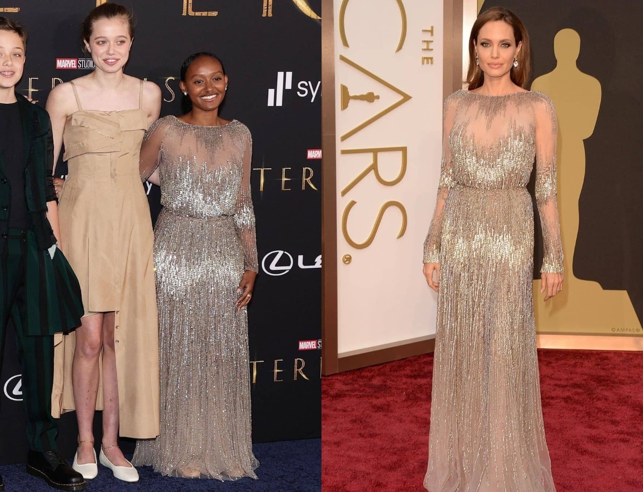 Также отличилась и 16-летняя дочь Джоли — Захара. Она появилась на премьере "Вечных" в платье, которое Анджелина надевала на премию "Оскар-2014".