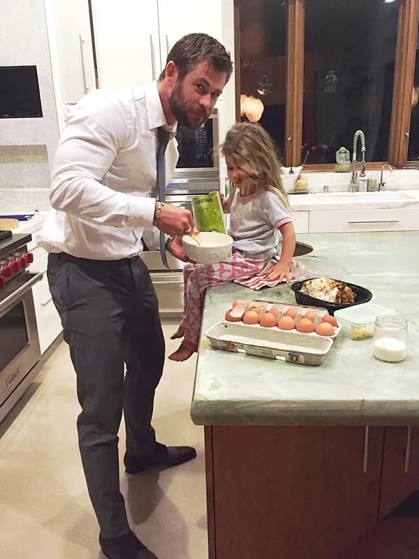 Крис Хемсворт готовит ужин со своей дочуркой Индией-Роуз. Согласитесь, "Тор" на этом снимке уже не выглядит столь брутальным.