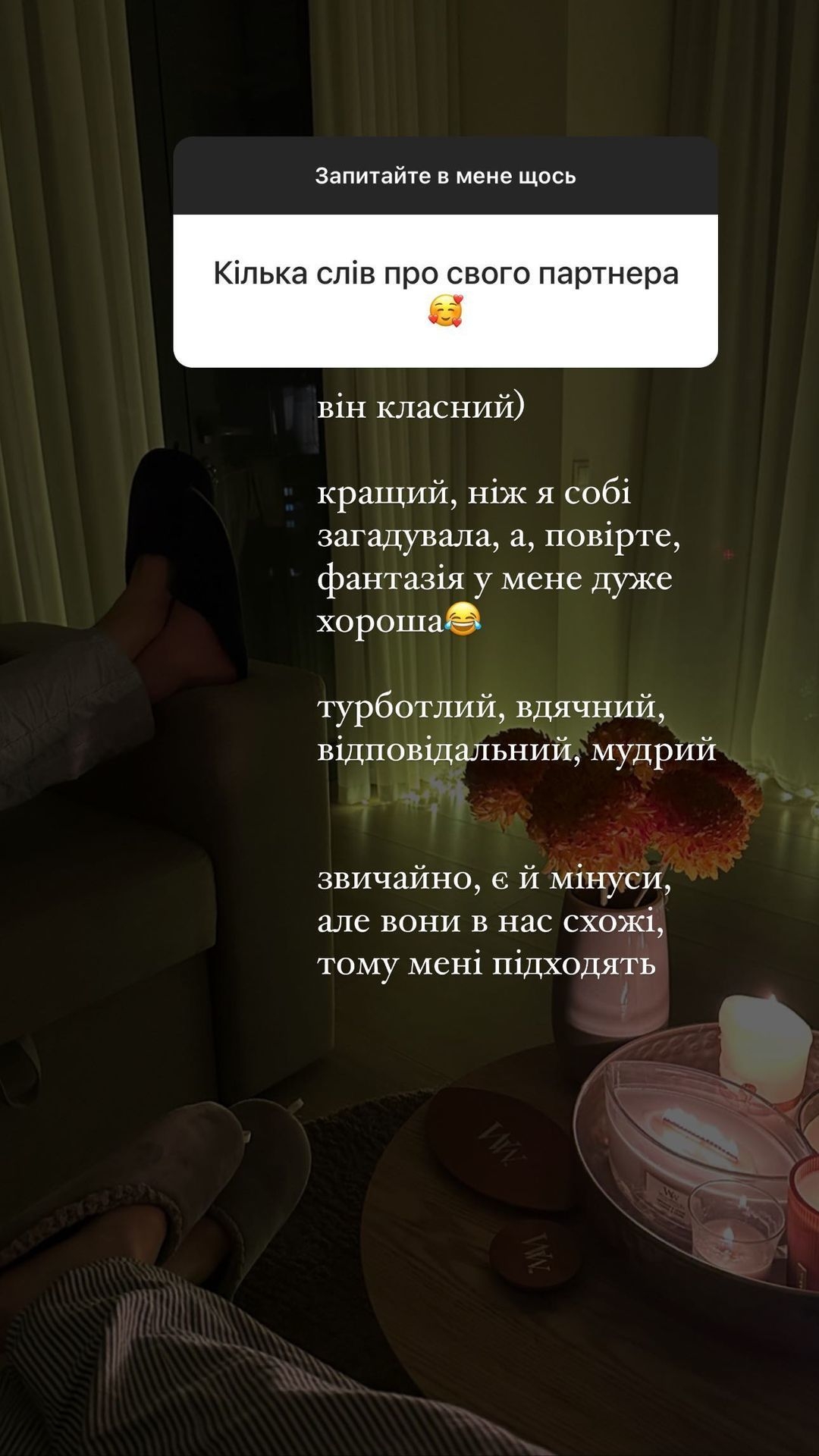 Он классный. Лучше, чем я себе загадывала. А поверьте, фантазия у меня очень хорошая. Заботливый, благодарный, ответственный, мудрый. Конечно, есть и минусы, но они у нас похожи, потому мне подходят,