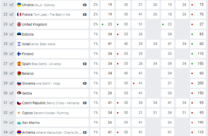 На вторую строчку рейтинга эксперты отправили италийского певца Diodato с балладой Fai rumore, а на третью позицию — Швецию, которая со дня на день назовет имя победителя Нацотбора.