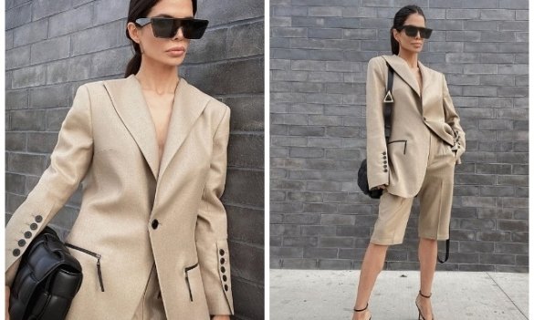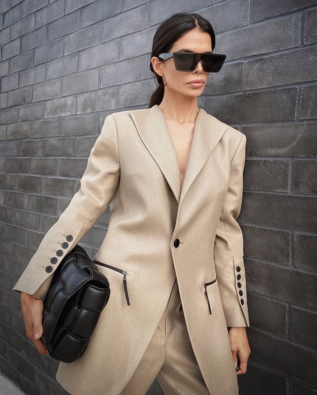 Сегодня, 16 сентября, Виктория Барбара опубликовала новую серию снимков, на которых позирует в брючном костюме песочного цвета из коллекции The Butterfly Effect украинского бренда Elena Burenina.