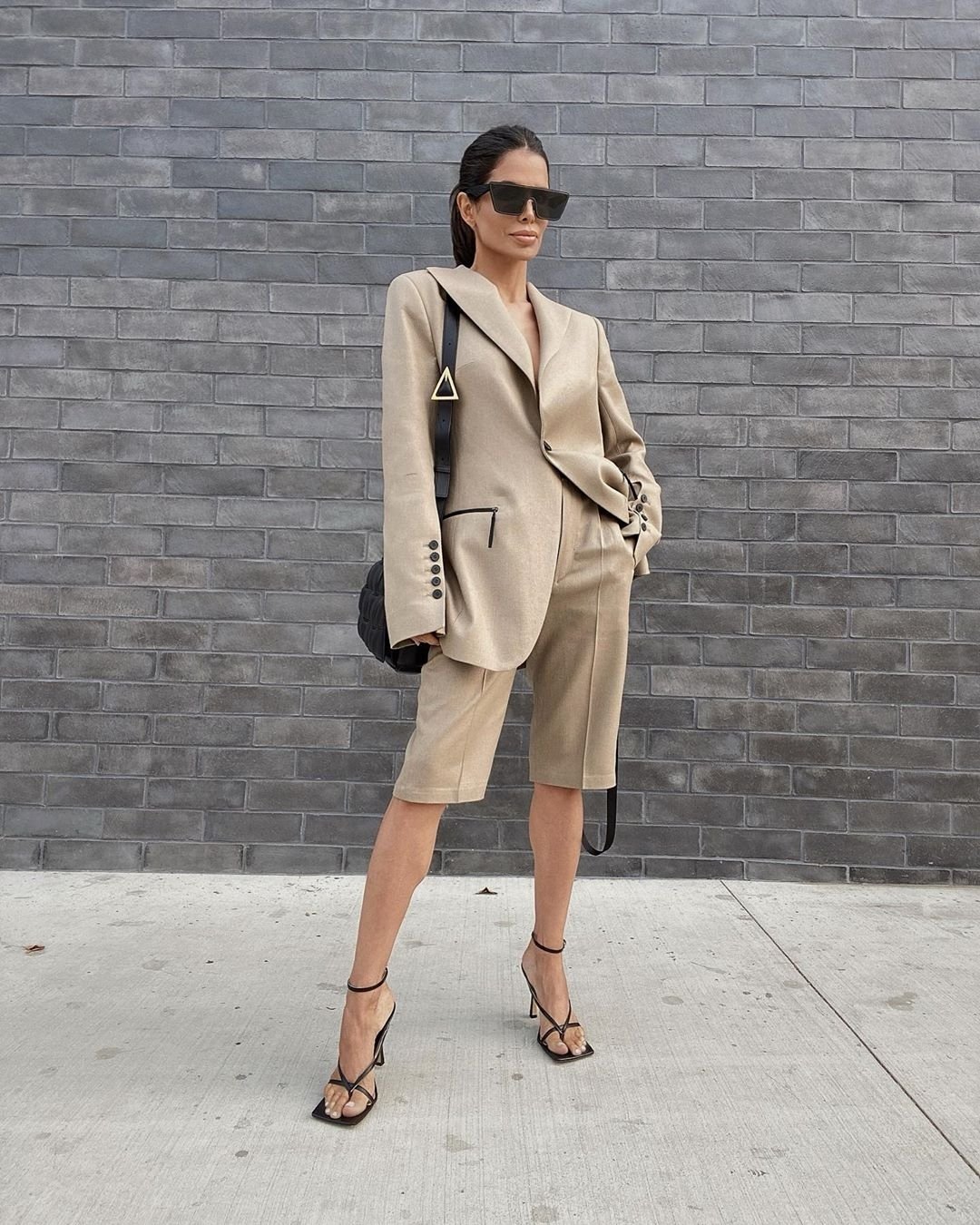 Нужно отметить, что брючный костюм — это самая универсальная и стильная вещь, которая никогда не выходит из моды, всегда остается актуальной и сочетается чуть ли не со всеми изделиями. Виктория дополнила костюм трендовыми босоножками с квадратным мысом, плетенной сумкой и классическими черными очками.
