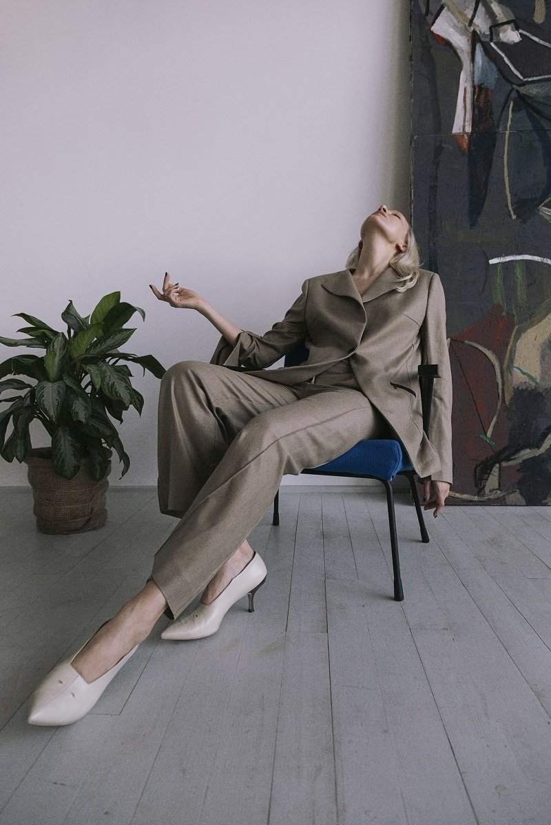 Я довольно долгое время подписана на Викторию в Instagram. Ее стиль сдержанный, но сексуальный, она любит сложный крой и необычные детали. Это очень созвучно с философией нашего бренда. На карантине мы с Викторией начали переписываться и она заказала два костюма из летней коллекции The Butterfly Effect и платье из коллекции Cloud Dancer. Мы попросили ее снять мерки и оказалось, что она совсем крохотная — пришлось ушивать и укорачивать все вещи.