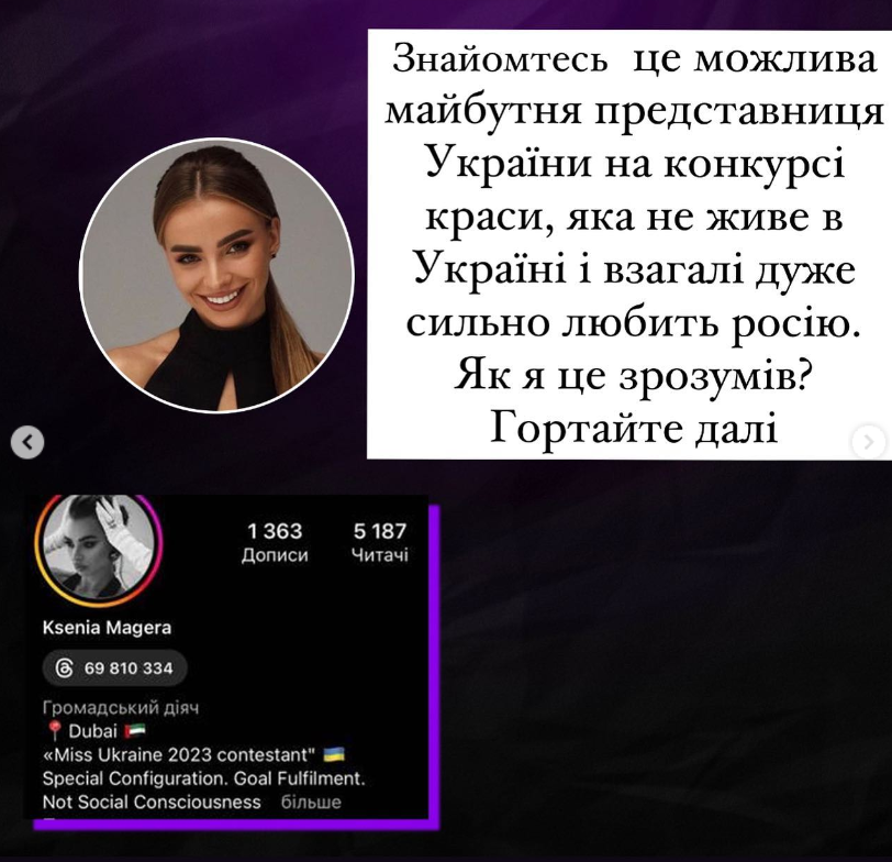 Зокрема Андрій Лузан "пройшовся" по 25-річній учасниці Оксані Магері. Комік дізнався, що живучи в Об'єднаних Арабських Еміратах, модель часто ходить до закладу російського ресторатора, який є палким шанувальником диктатора путіна. Крім того, сама Оксана більш ніж пов'язана з країною-агресором, адже раніше вона жила в Москві та брала участь у конкурсі краси "Майбутнє росії".