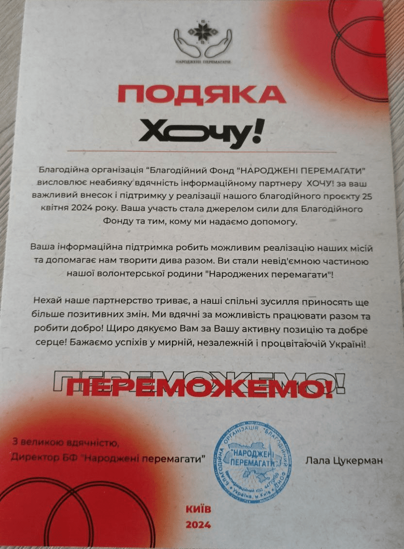 🌸 У 2024 році Hochu.ua отримав подяку від БФ "Народжені перемагати" за інформаційну підтримку благодійного жіночого бранчу на тему "Мистецтво бути жінкою", метою якого був збір коштів на допомогу 4 дітям з інвалідністю з Кривого Рогу. Наразі ними опікується пенсіонерка, рідний син якої захищає Україну в лавах ЗСУ.